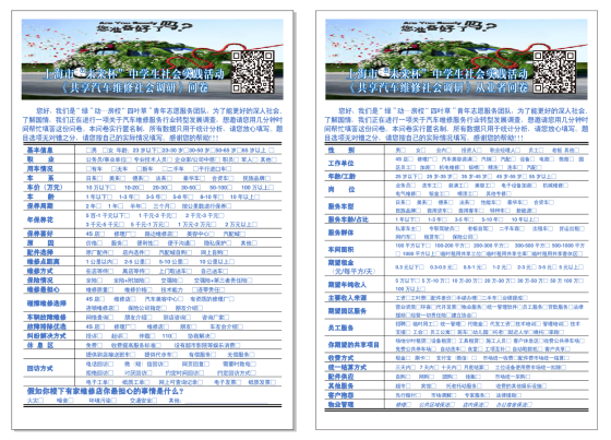 项目简要说明一、项目背景:由上海房地产学校和上海车地产商务调查模拟有限公司为参加上海市“未来杯”中学生社会实践绿色环保共享汽服《共享汽修大调研》而进行社会实践调查一系列活动二、项目概况:于2019年7月8日已进行过调查前培训工作于2019年7月14日准备进行《共享汽修大调研》三、项目说明:为了能更好的引领阶段中职学生深入社会、了解国情,培育和践行社会主义核心价值观,增强责任意识、创新精神和实践能力,坚定跟党走中国特色社会主义道路的理想信念。“绿”动—房校“四叶草”青年志愿服务团队与上海宝山车洋职业技术培训学校